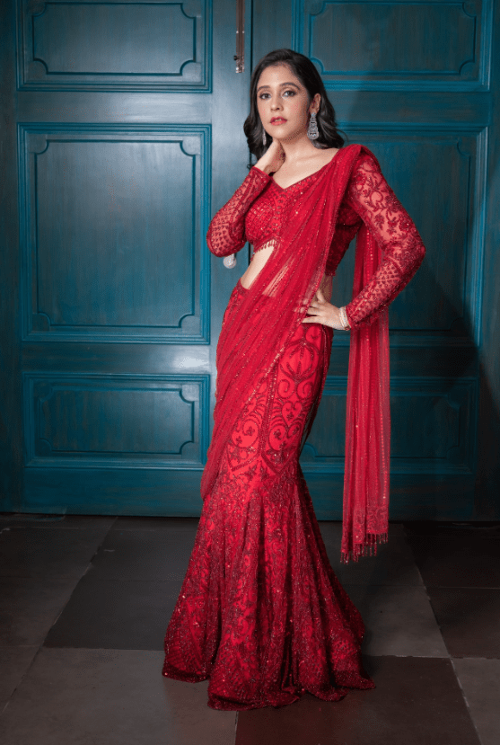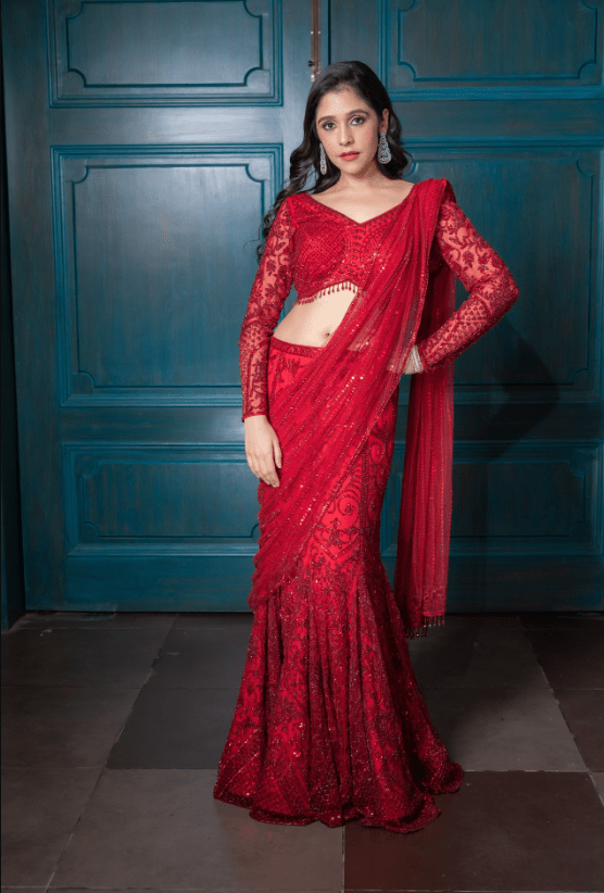 This pre-draped red saree is hand embroidered with sequin, crystal, bead and cutdana detailing. The outfit is paired with an embellished full sleeves blouse with sequin and crystal detailing.