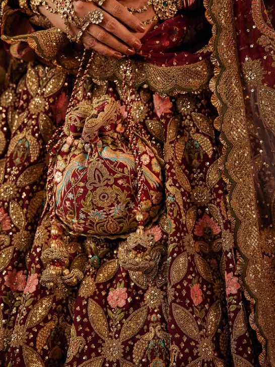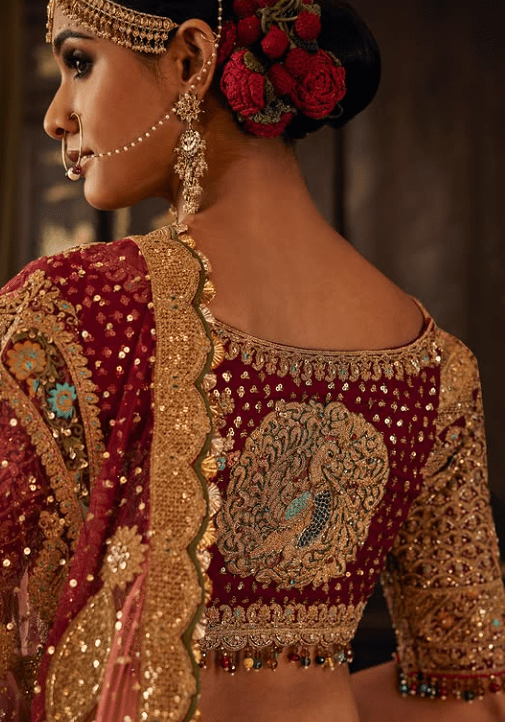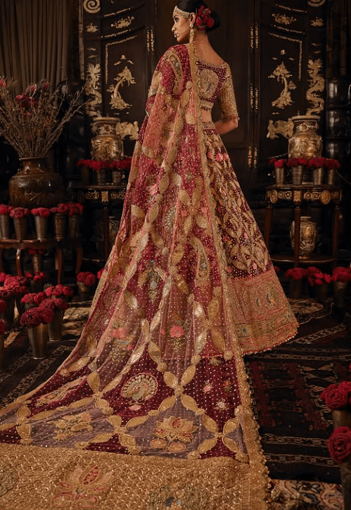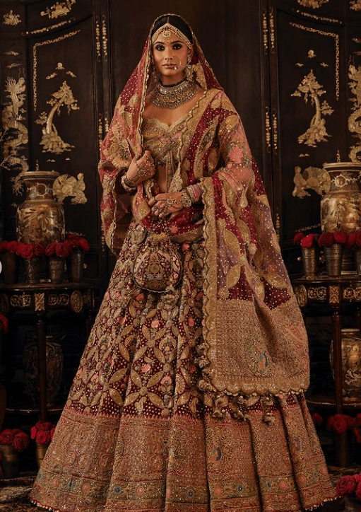 a deep ruby pink tulle lehenga. The skirt features artworks gleaned from Mughal era prachin-kari (pietra-dura) inlay work and archival textile fragments. It is paired with an illusion tie-up choli and the look is completed with an embroidered tulle dupatta.