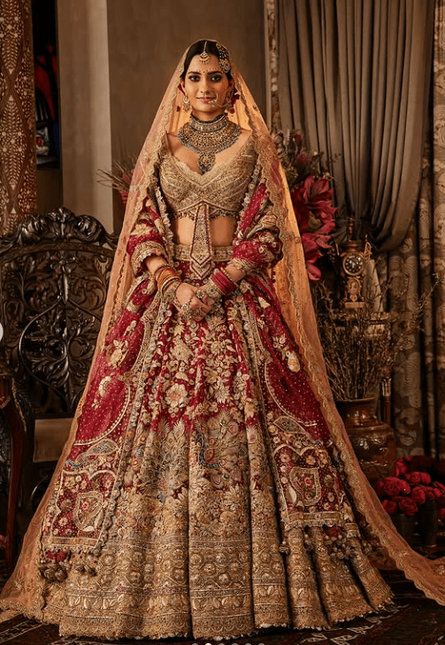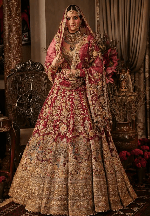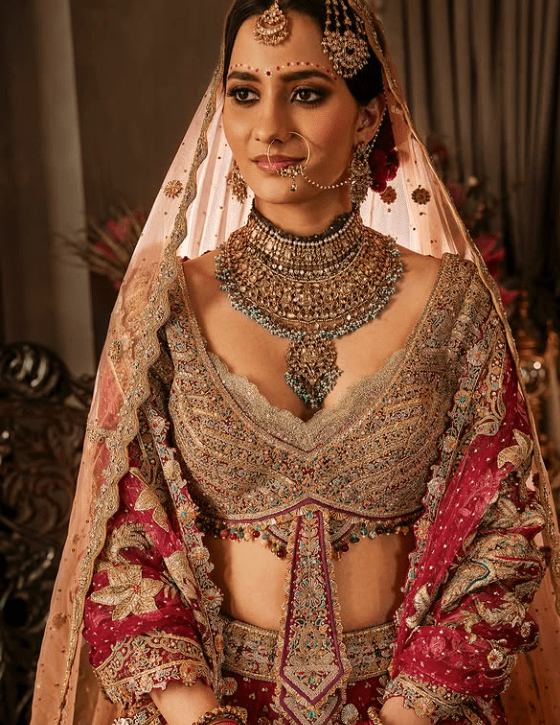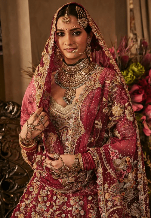 a deep ruby pink tulle lehenga. The skirt features floral and avian artworks derived from a melange of references- archival Pichhwai textile fragments, Mughal miniature art and Persian carpets. It is paired with an illusion tie-up choli and a diaphanous tulle dupatta. The look is complemented with a sheer veil.