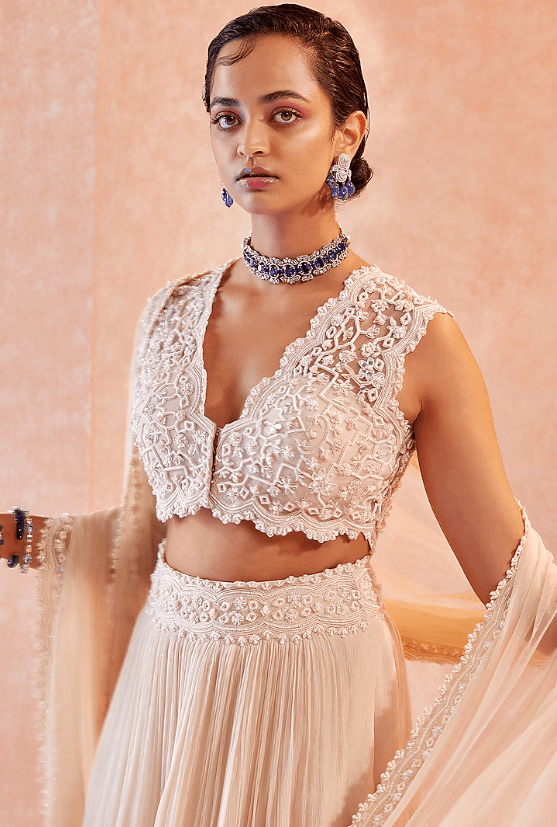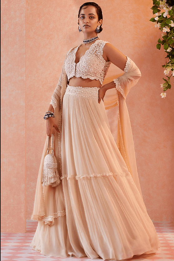 Featuring a dirty ivory two tiered skirt in chiffon base. It is paired with a matching net embroidered blouse and a dupatta.