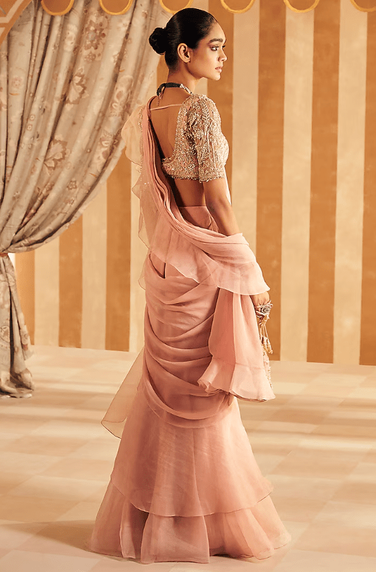 Dusky Pink Draped Saree Set that captivates with its elegance. The eye-catching saree is crafted in chiffon with organza ruffles. It is paired with a net embroidered blouse. Style it with statement jewellery and heels for a wedding or engagement ceremony, showcasing style and sophistication.