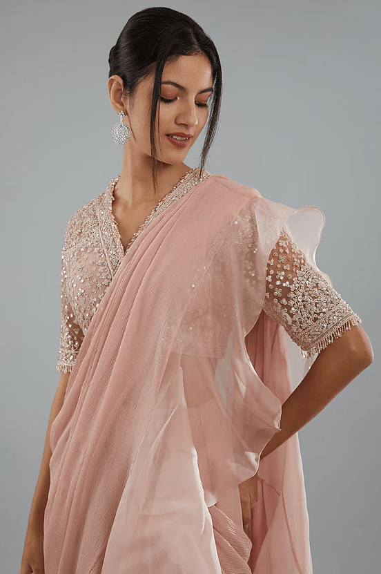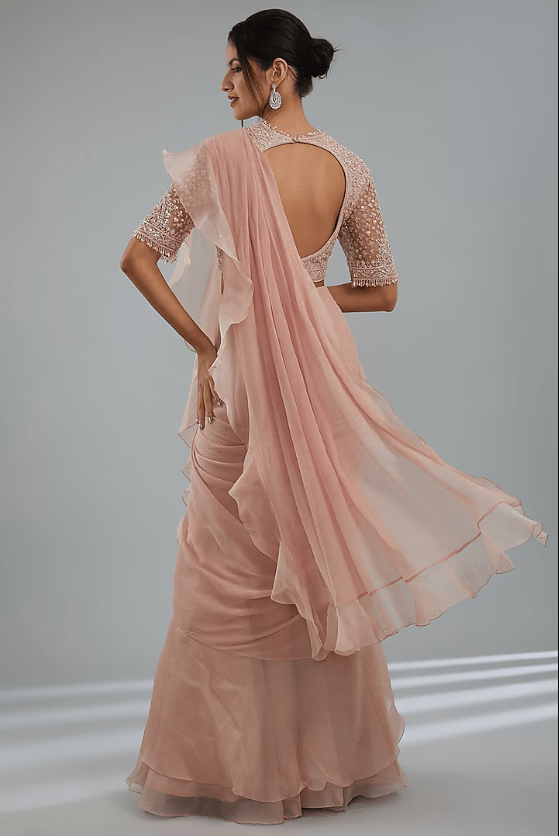 Featuring a dusty pink draped saree in chiffon and organza base with ruffle details. It is paired with a net blouse having sequins embroidery. Accentuate the outfit with dangler earrings and heels for a festive look.