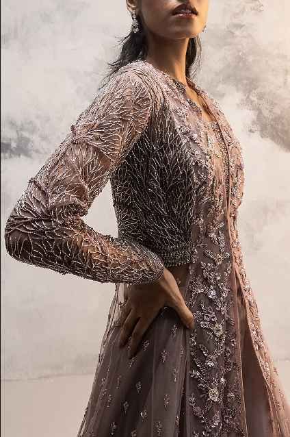 Featuring a dusty purple jacket gown in net base with floral embroidery. It is paired with a matching organza flared skirt