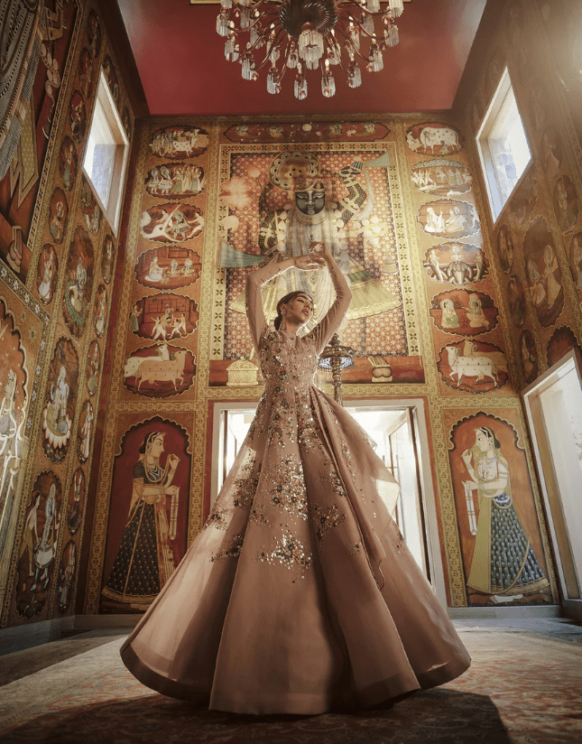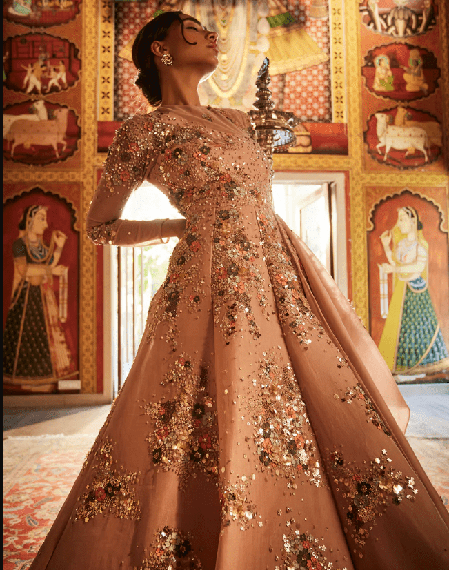 A stunning ball gown lavishly adorned with heavy hand embroidery.