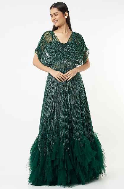Featuring an emerald green jacket in net base with embroidery and attached hand-cut frills. It is paired with a matching skirt and a bustier.