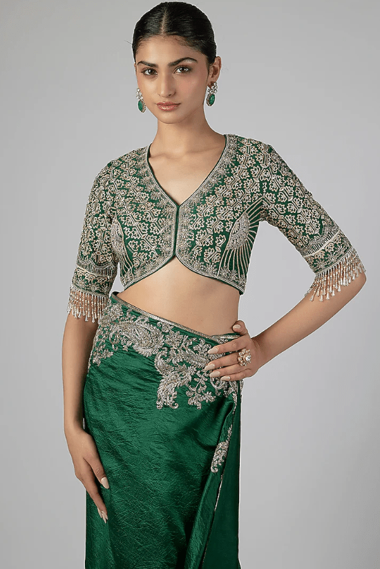 Featuring an emerald green saree in silk base with zardosi embroidery. It is paired with an embroidered blouse. Accentuate it with statement jewellery, a low bun and heels for a wedding, mehendi, sangeet or engagement ceremony.