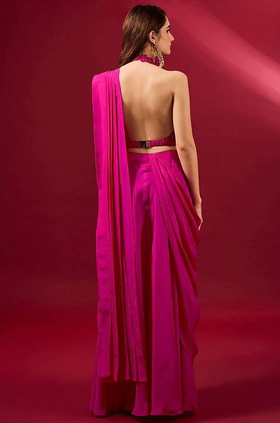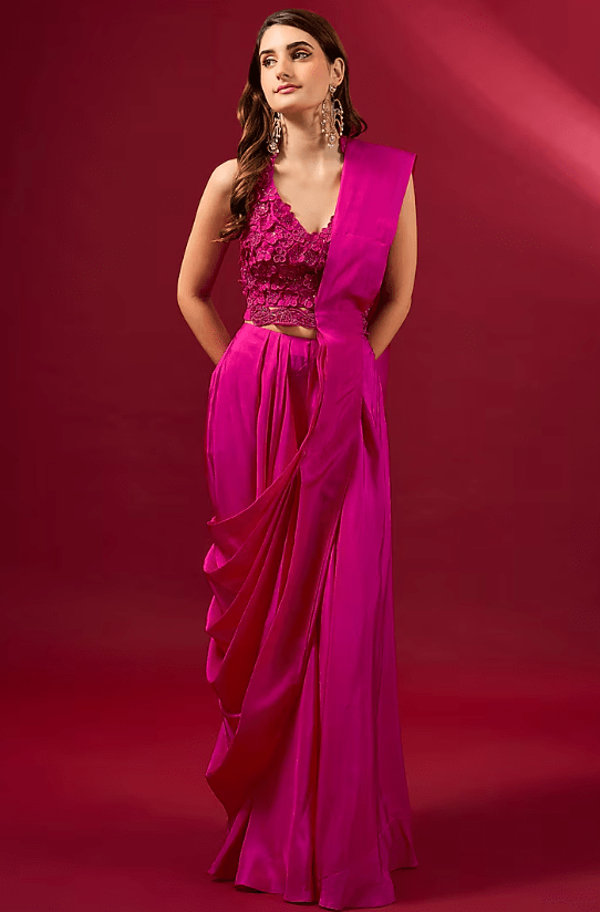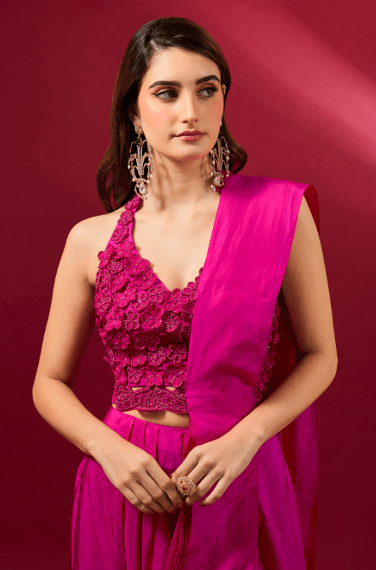 Featuring a fuchsia saree in organza and flat chiffon base. It is paired with a blouse. Accentuate it with statement jewellery and heels for a festive occasion or pooja ceremony.