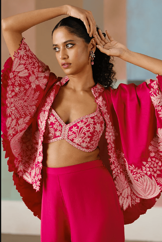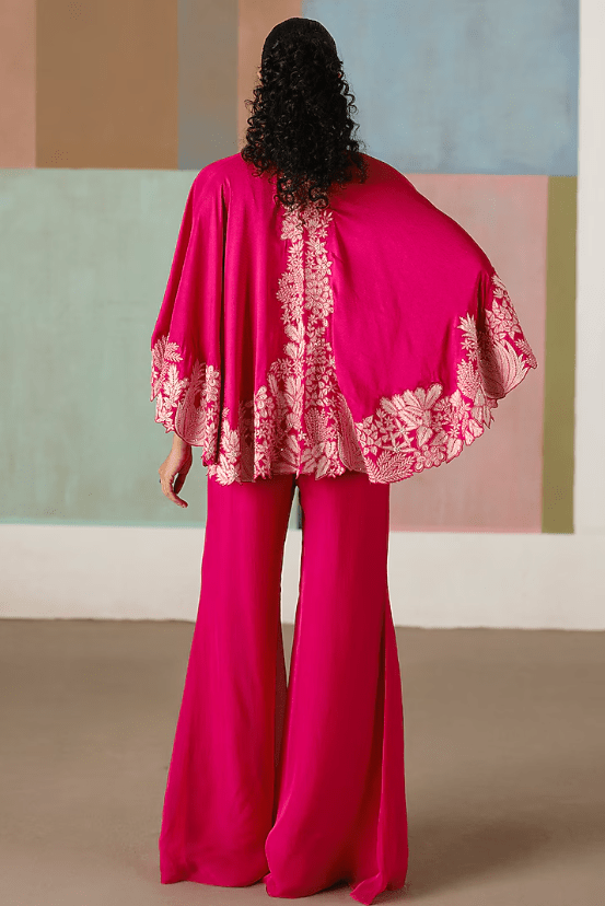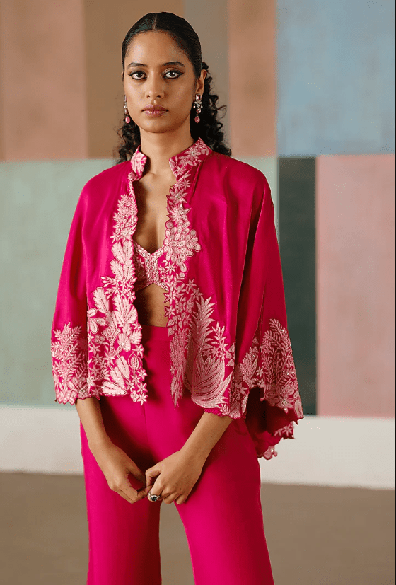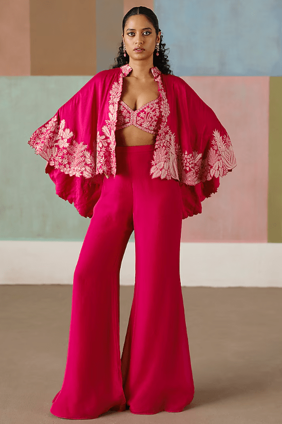 Featuring a fuchsia cape in silk base with embroidery. It is paired with an embroidered bustier and organza pants. Accentuate it with statement earrings and heels for a festive occasion, engagement or sangeet ceremony.