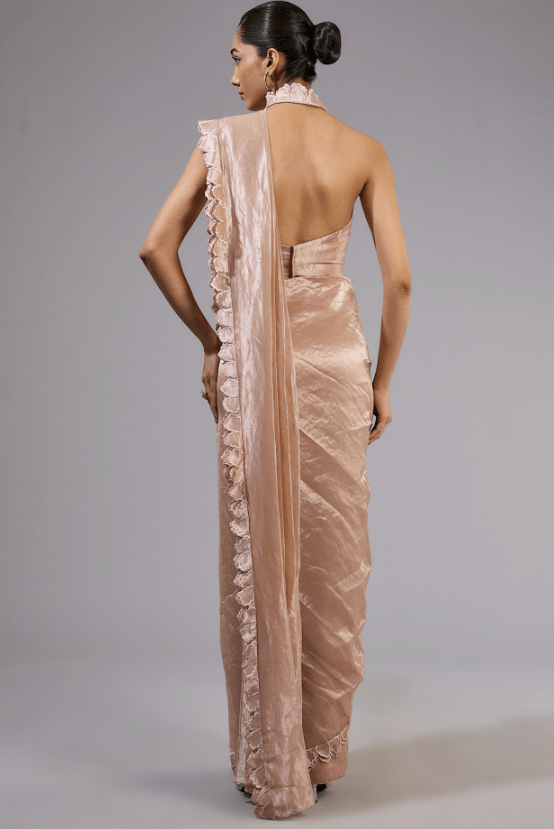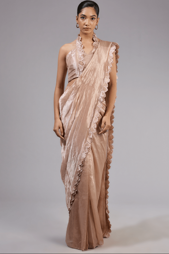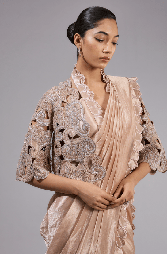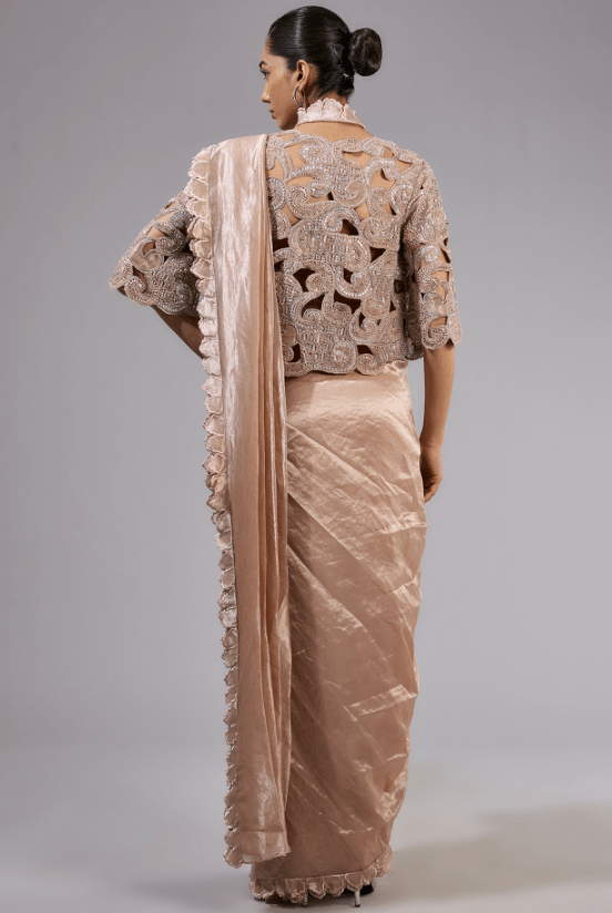 Featuring a gold saree in tissue foil base with floral frill details. It is paired with a blouse and a cutwork embellished jacket. Accentuate it with statement jewellery and heels for festive occasions or wedding ceremonies.