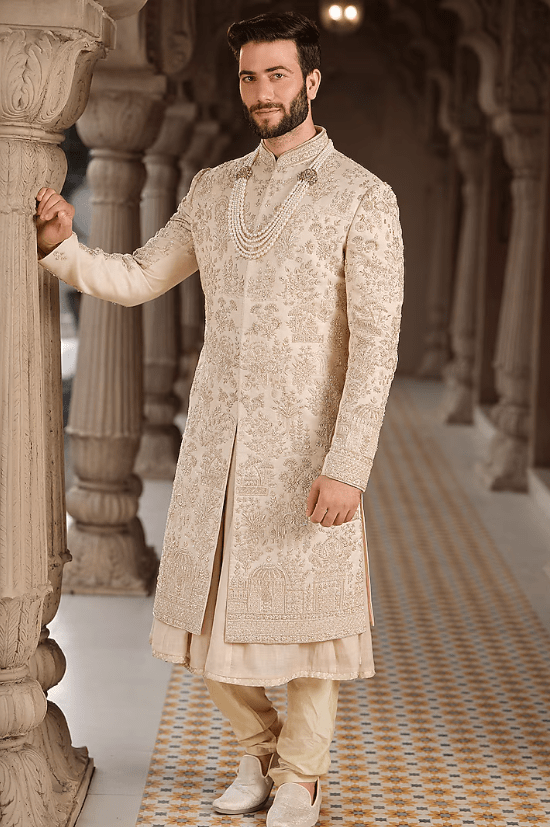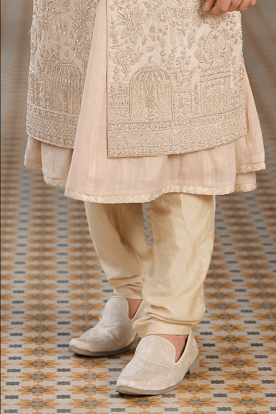 Featuring a gold sherwani in tissue base with kora work. It is paired with a kurta and aligarhi pants. Style it with pair of mojaris for a wedding or engagement ceremony.