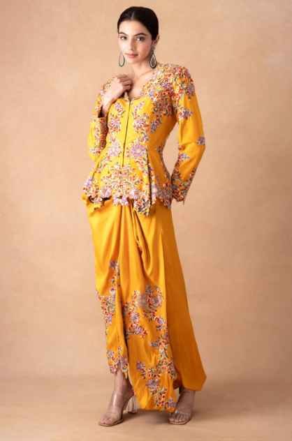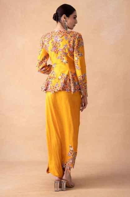 Golden Yellow Floral & Sequin Top-Drape Skirt Set