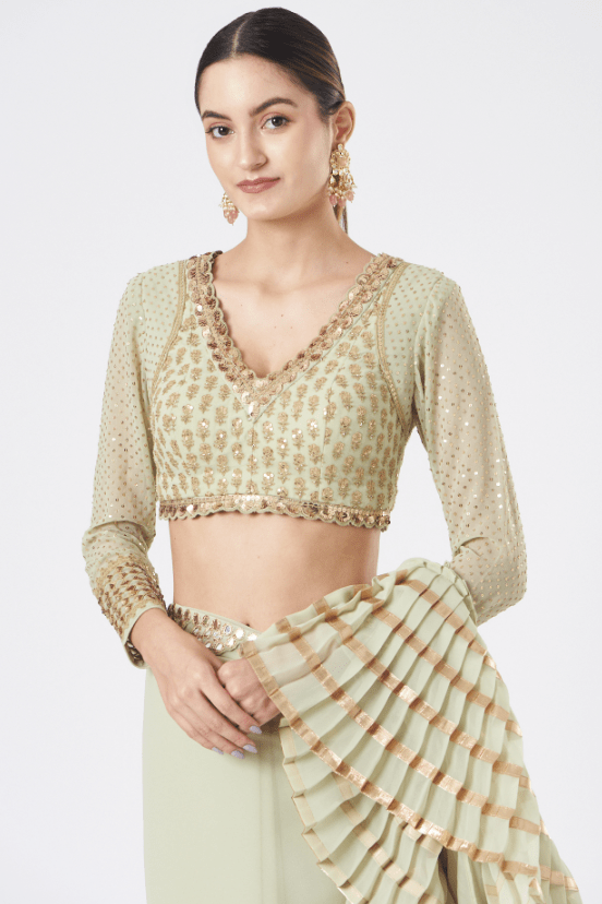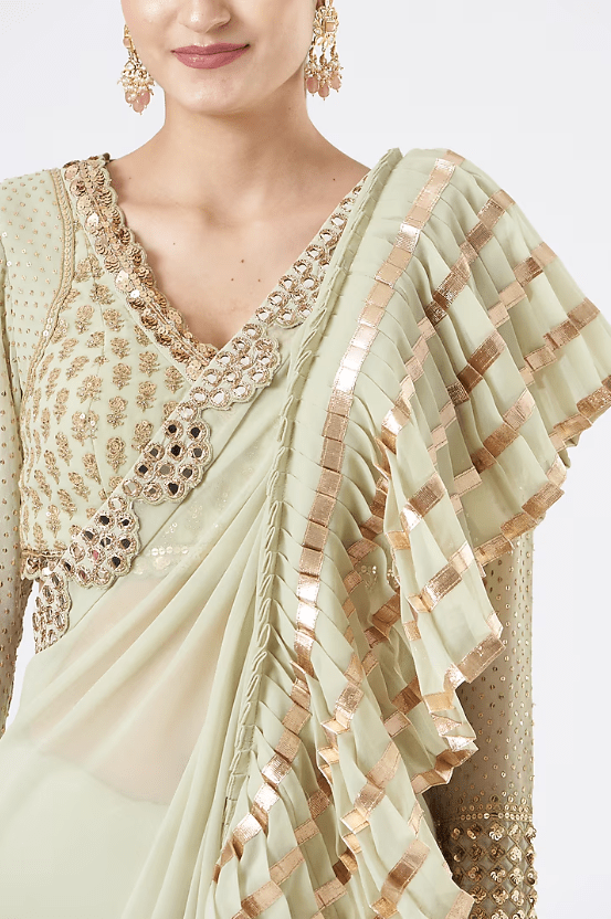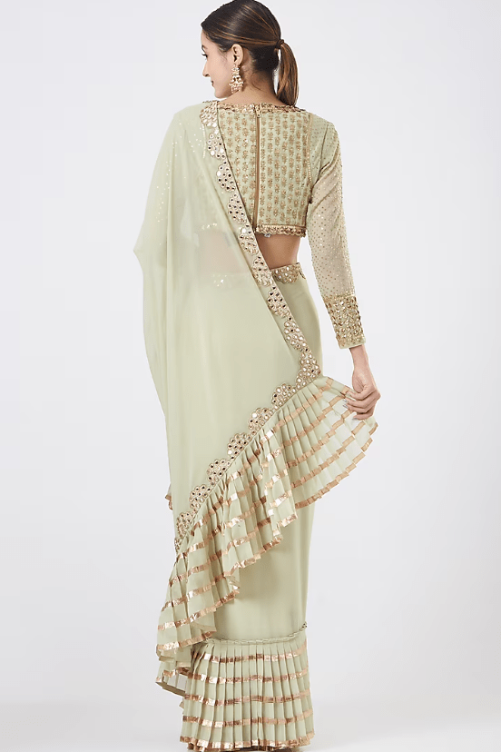 Featuring a sap green ruffled saree in georgette base. It is paired with a blouse. Accentuate with statement jewellery and heels for a wedding, sangeet or cocktail ceremony