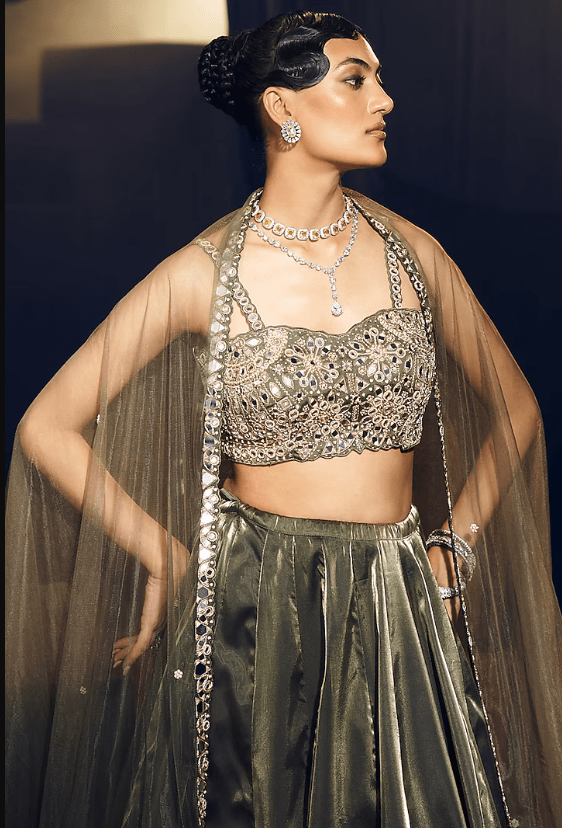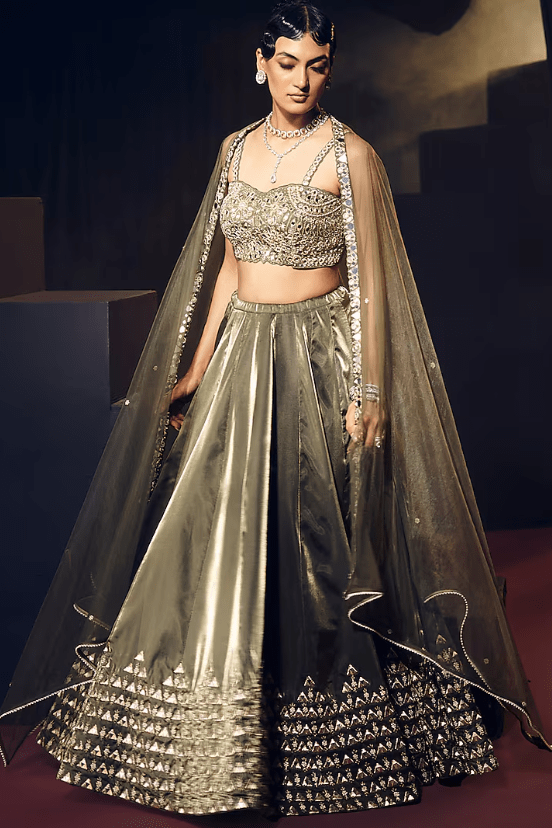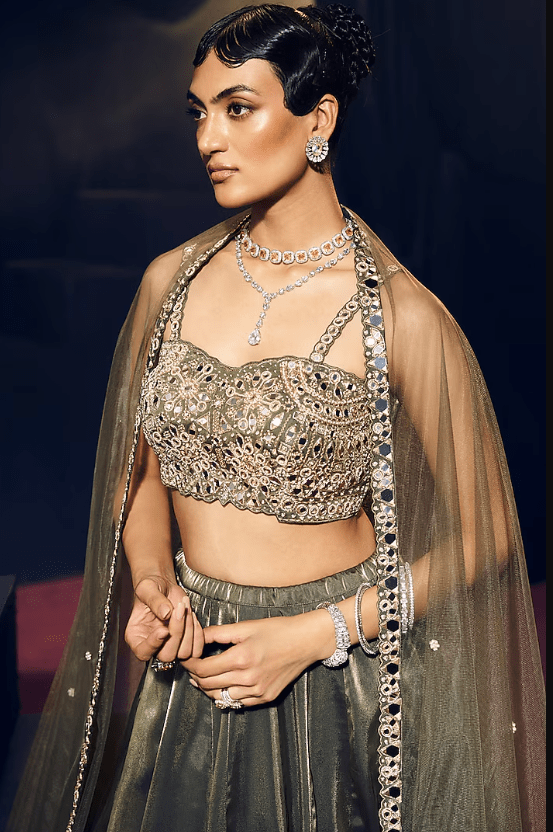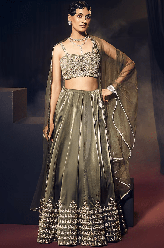 Featuring a green panelled lehenga in tissue organza silk and net base, adorned with mirror and zardosi embroidery. It is paired with a blouse having geometric and floral motifs, including a dupatta. Accentuate the lehenga set with polki jewellery, a waist-bag, and embellished heels for sangeet, wedding ceremony or festive occasions. This ensemble is a beautiful fusion of contemporary style and timeless tradition.