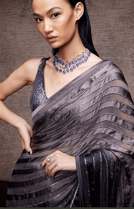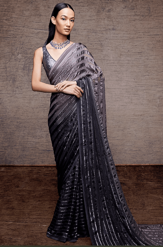 Featuring a grey saree in satin base with stripes and sequins work. It is paired with a matching sequins blouse and a petticoat.