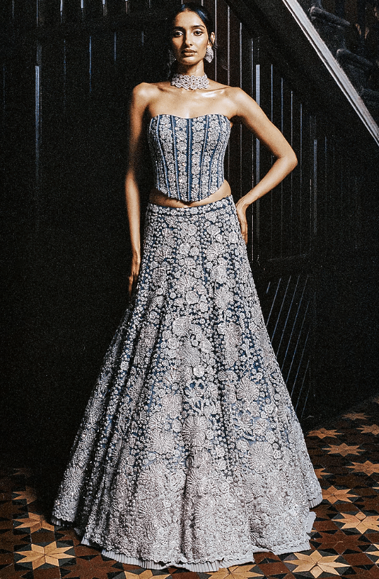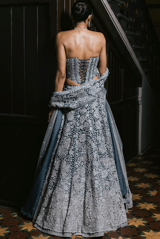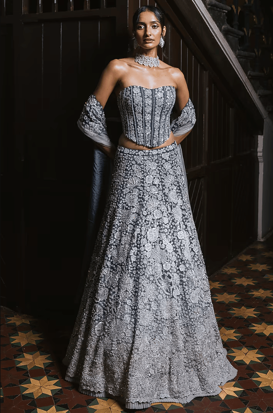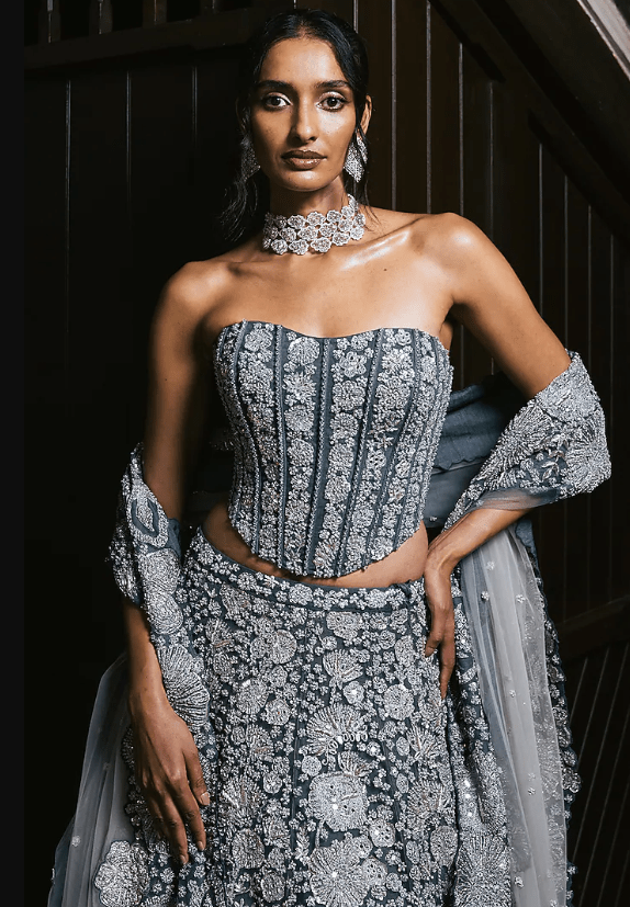 Grey Lehenga Set that captivates with its elegance. The eye-catching lehenga is crafted in tulle with metallic and floral embroidery. It is paired with an embroidered corset and an embroidered dupatta. Accentuate the designer lehenga set with soft curls, pearl or zircon jewellery, embellished heels and a statement clutch for a bridal look. Perfect for wedding ceremonies, sangeet nights or engagement evenings.