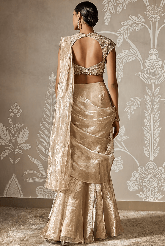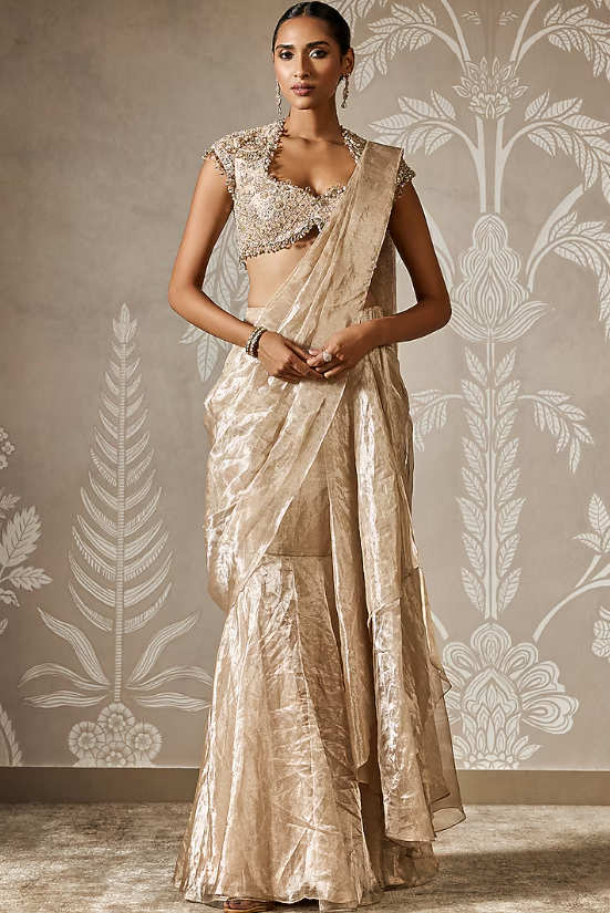 gunmetal gold draped saree in tissue base. It is paired with a net embroidered blouse having cap sleeves. Accentuate the designer saree set with statement jewellery and heels for festive occasions or wedding ceremony.