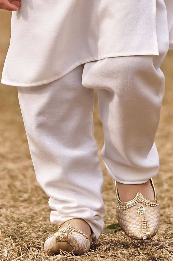 Featuring a hot pink nehru jacket for boys in silk base with thread embroidery. It is paired with a silk kurta and pants. Style it with mojris and a watch for casual wear or any festive occasion.