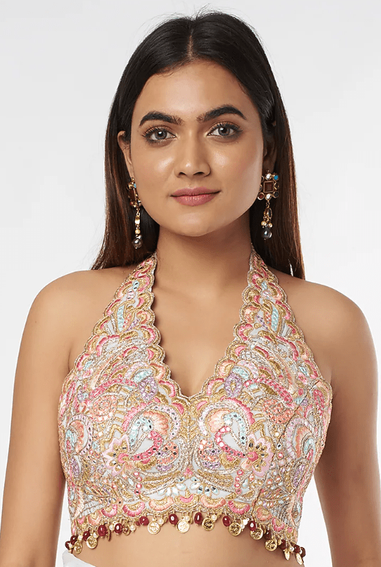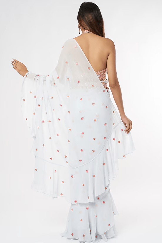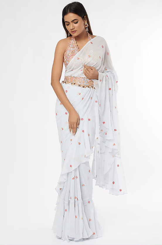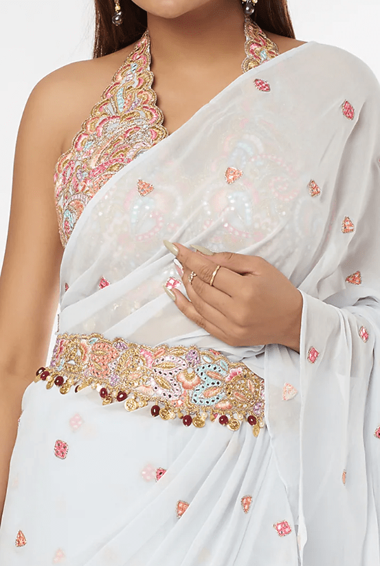 Featuring an ice blue ruffled saree in georgette base. It is paired with a matching halter neck embroidered blouse, a belt and a petticoat.