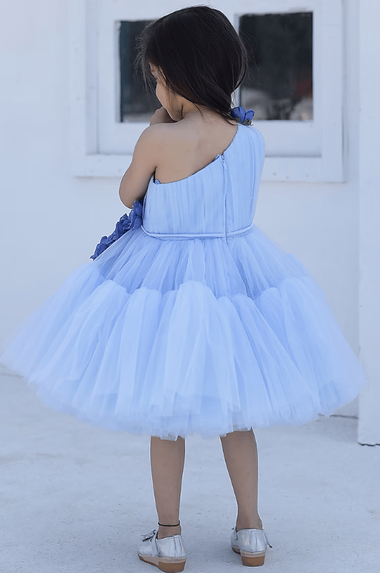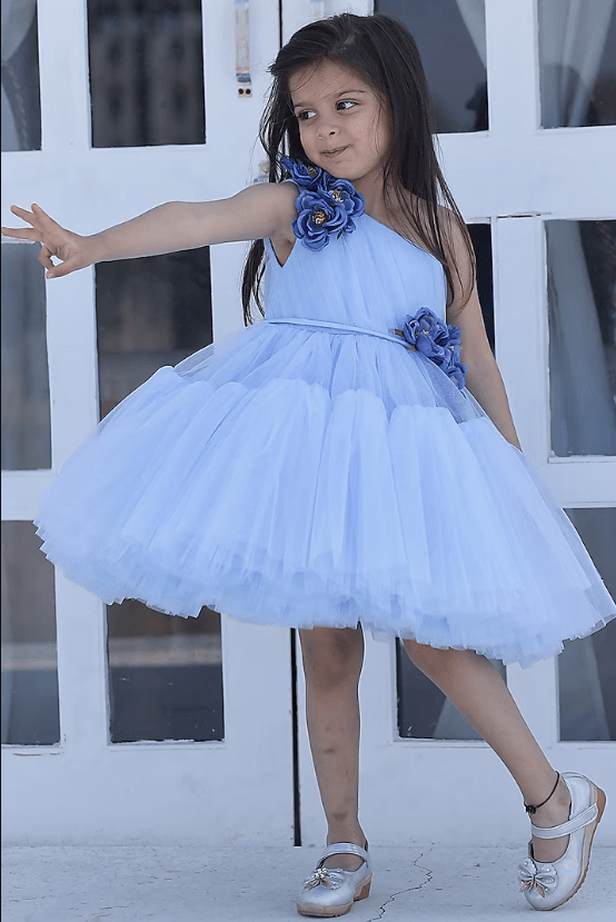 Featuring an ice blue sleeveless dress for girls in net and silk base with tulle drape and floral detail on shoulder. It is paired with a hair pin. Style it with cute hair accessories and sandals for birthday parties or festive occasion.