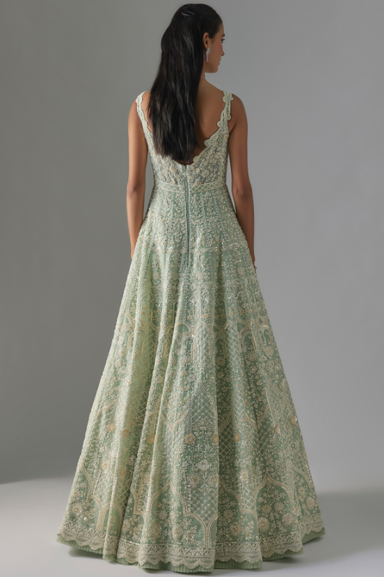 Featuring an ice blue gown in organza base with embroidery. Accentuate it with statement earrings and heels for a perfect wedding or a reception look.