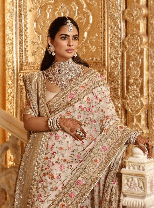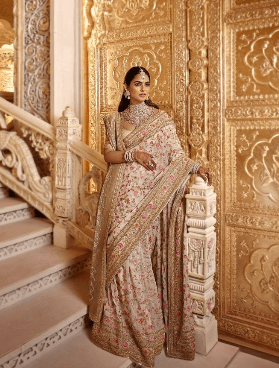 Isha Ambani in a beige color saree,fully hand embroidered