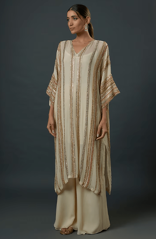 Featuring an ivory kaftan in chiffon base with sequins embroidery. It is paired with palazzo pants and an inner. Accentuate it with polki jewellery, an embellished clutch and heels for a wedding, sangeet or festive occasion.
