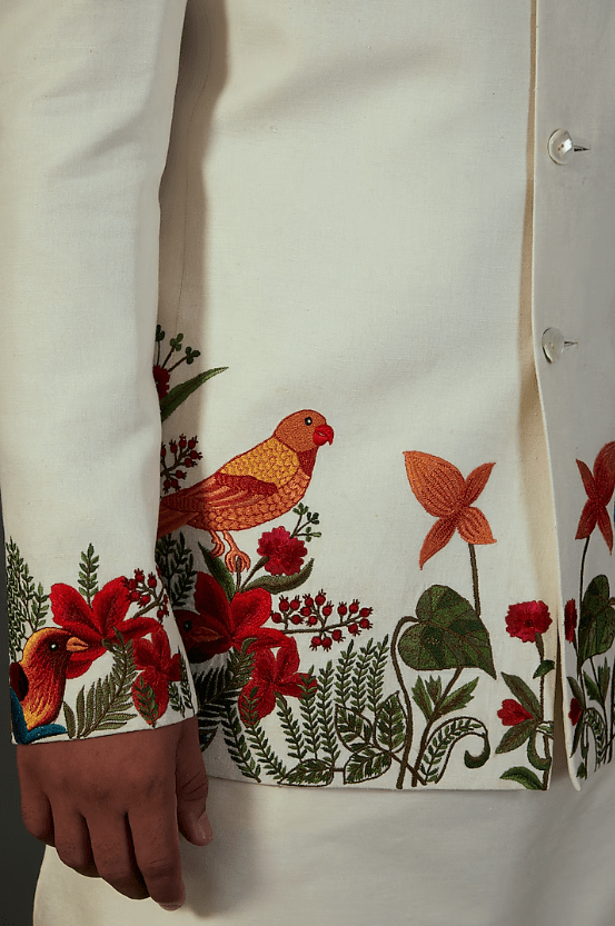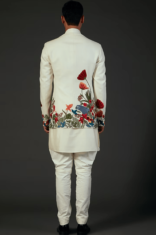 Featuring an ivory bandhgala jacket in matka silk base with floral machine embroidery. This contains only one piece.