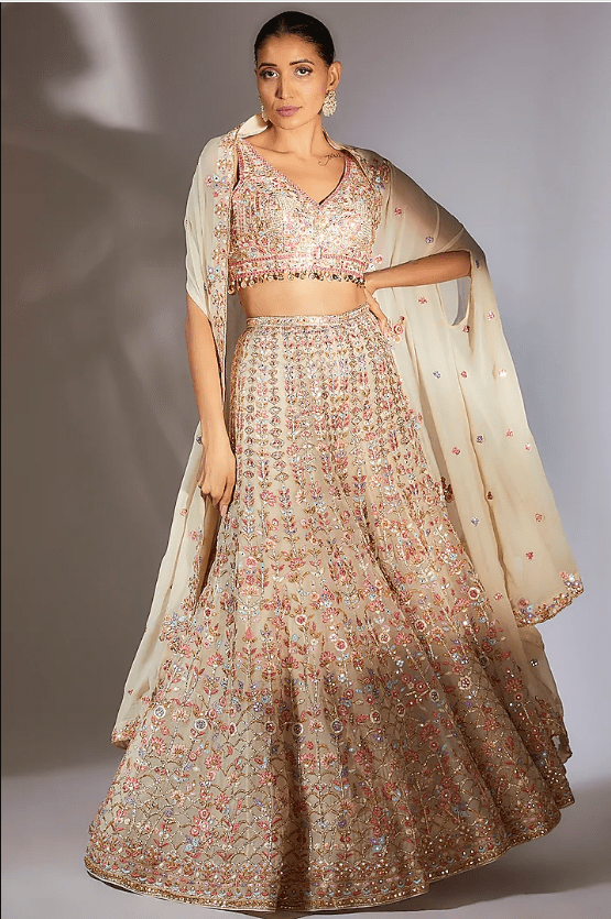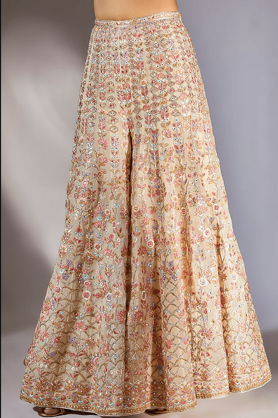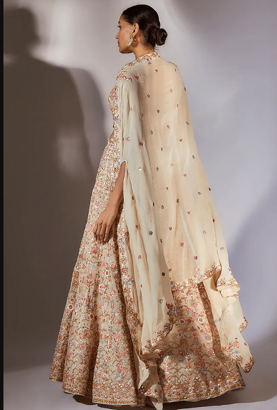 Featuring an ivory cape in georgette base with resham, mirror, foil, dori and gota embroidery. It is paired with matching embroidered sharara pants and a choli.