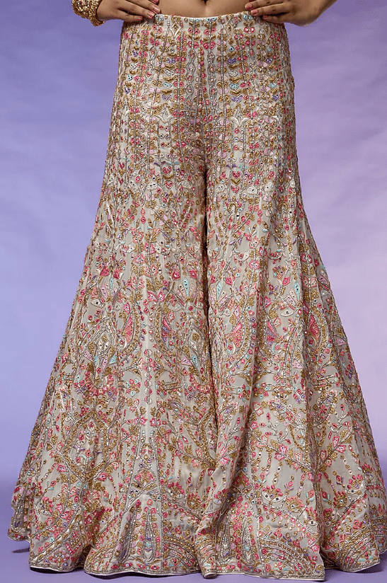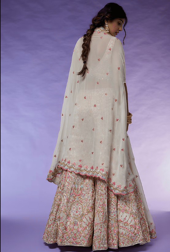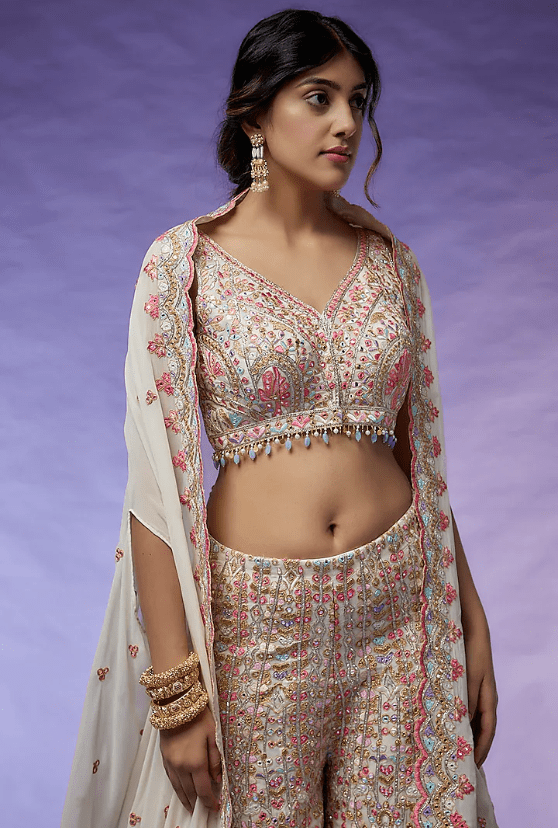 Featuring an ivory choli in georgette base with resham, gota, foil and mirror embroidery. It is paired with sharara pants and a cape. Accentuate this statement sharara set with heels and dangler earrings for a bridal look or engagement ceremony.