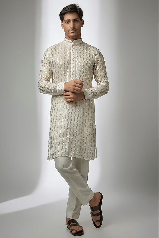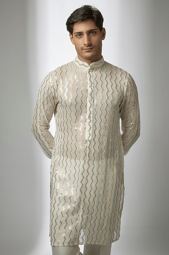 Featuring a ivory kurta in georgette base with sequins work. It is paired with cotton silk pants. Perfect wear for festive occasions or sangeet ceremony, exuding traditional charm and elegance.
