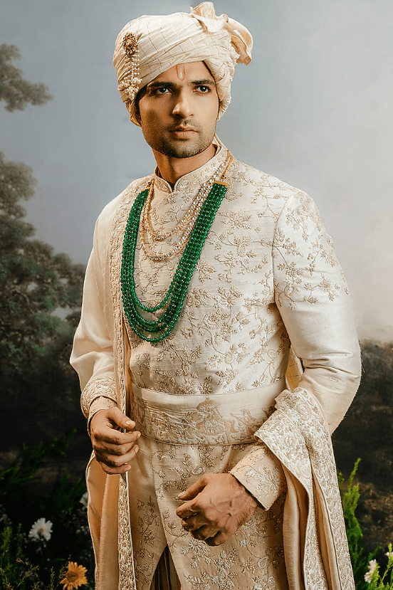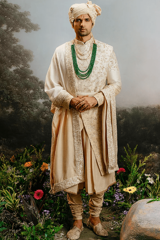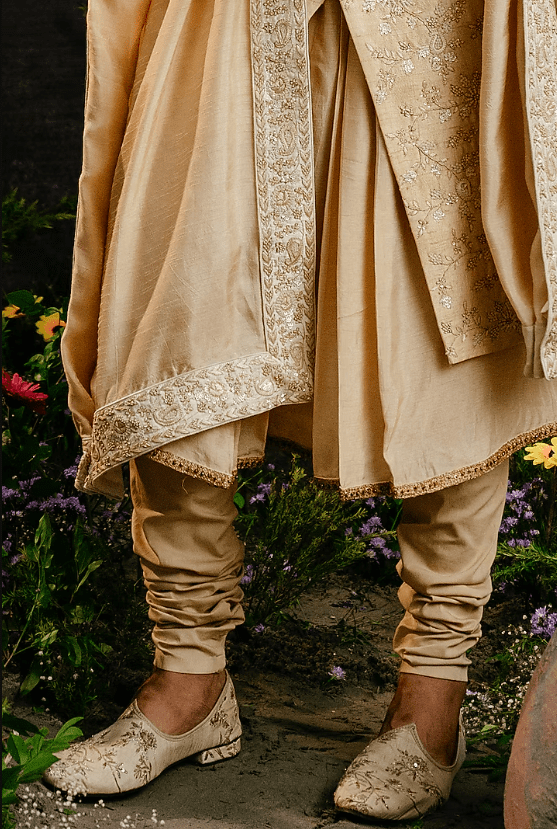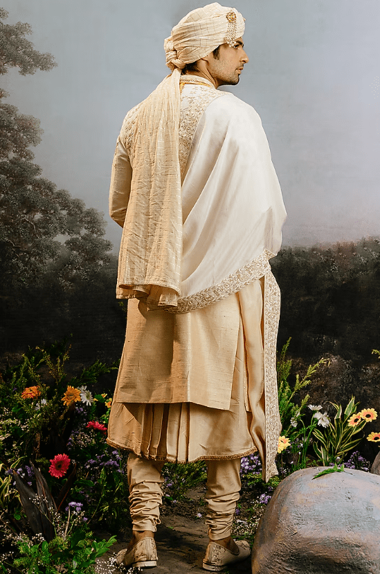 Featuring an ivory gold ombre sherwani in raw silk base. It is paired with a kali kurta, churidar pants and a dupatta. Perfect wear for your wedding or engagement ceremony, exuding traditional charm and elegance.