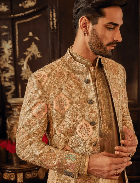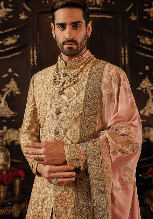 On Eduardo, an ivory-gold silk sherwani. The jacket features a tessellated dabbi jaal derived from Mughal architectural references which is layered with floral, paisley and avian motifs gleaned from Mughal miniatures. It is paired with a textured kurta, a churidar pyjama and handcrafted shoes. The look is completed with an embroidered dushala.