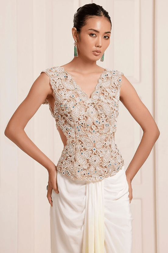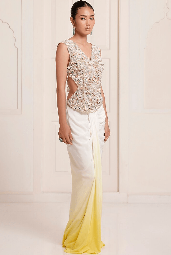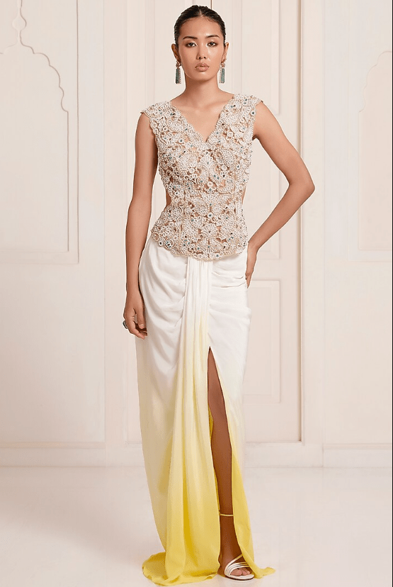 Featuring an ivory top in net and georgette base with back tie-up detail and pearl embroidery. It is paired with an ombre skirt. Accentuate it with dangler earrings and heels for a festive occasion, cocktail, haldi, engagement or sangeet ceremony.