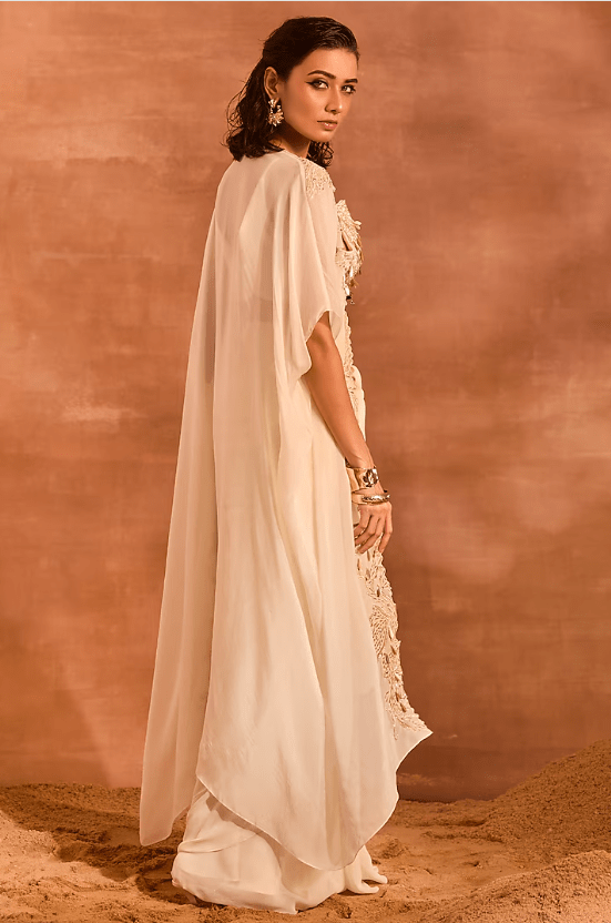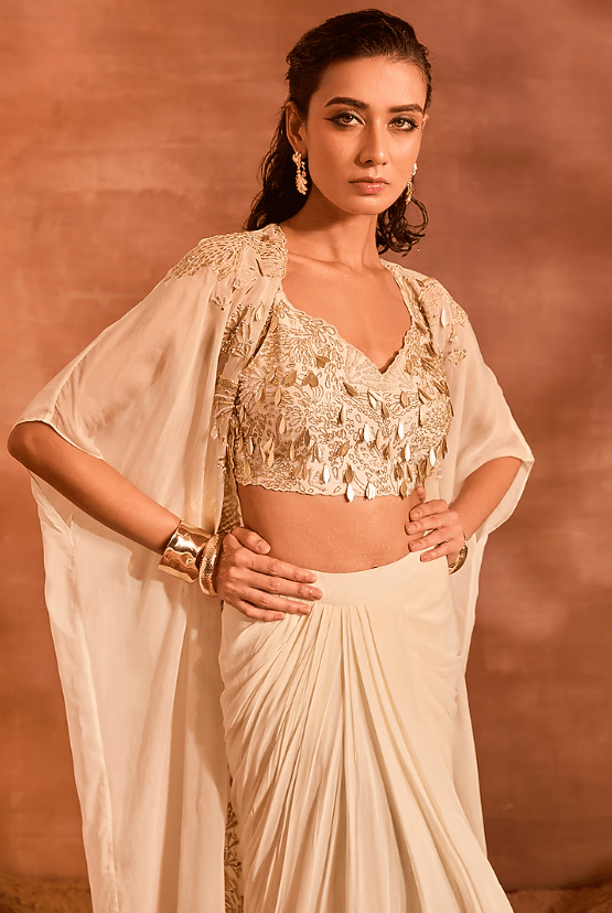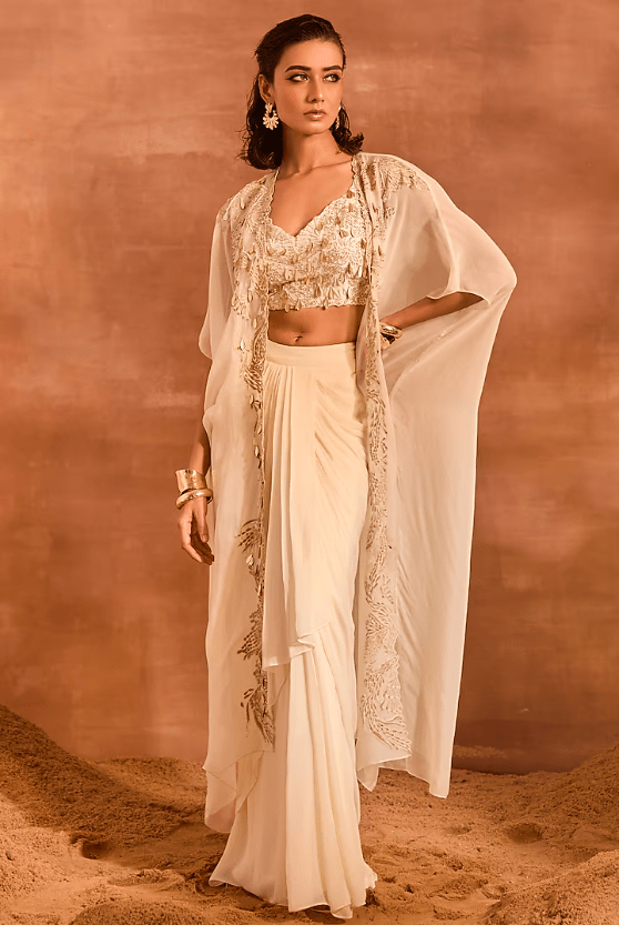 Featuring an ivory cape in organza base with embellishment. It is paired with a georgette draped skirt and a chanderi silk blouse. Accentuate it with statement jewellery and heels for sangeet ceremonies.