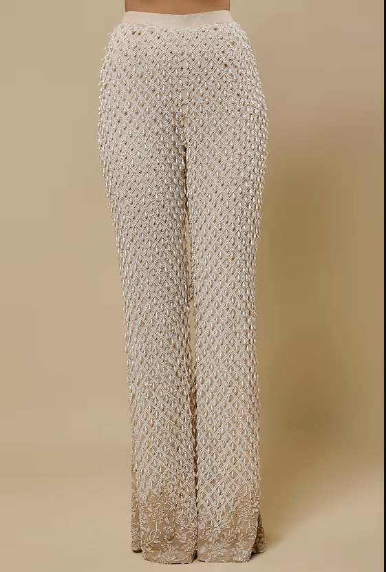 Featuring an ivory cape in organza base with embellishments. It is paired with a georgette cami top and pants. Accentuate it with statement jewellery and heels for a cocktail party.