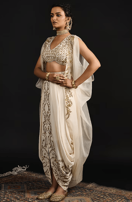 Featuring an ivory cape in organza base with dabka, zardosi, zari, nalki, and sequin hand embroidery. It is paired with a double georgette embroidered blouse and a dhoti skirt. Accentuate with statement jewellery and heels for a festive occasion or sangeet ceremony.