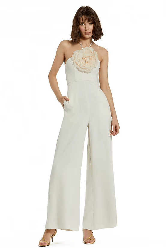 Featuring an ivory jumpsuit in polyester base with a cross-halter neckline and intricate 3D floral detailing. Accentuate it with statement earrings and heels for evening soirees or cocktail parties.