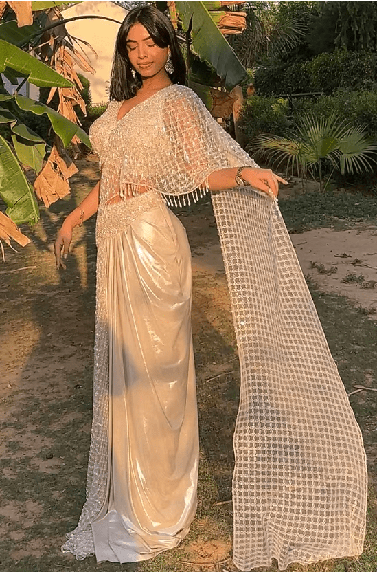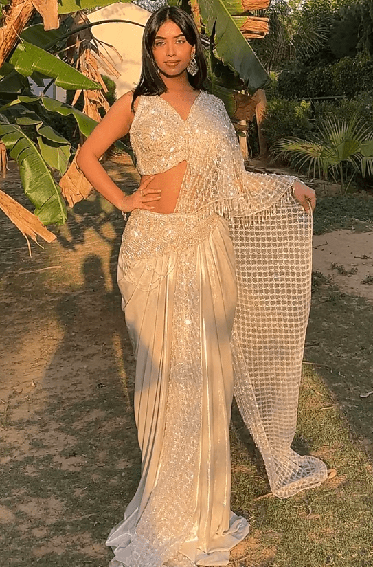 Featuring an ivory pre-draped saree in premium lycra and net base with zarkan, pearl, sequins and cutdana embroidery. It is paired with an embroidered net blouse. Accentuate it with statement jewellery or heels for weddings or sangeet ceremonies.