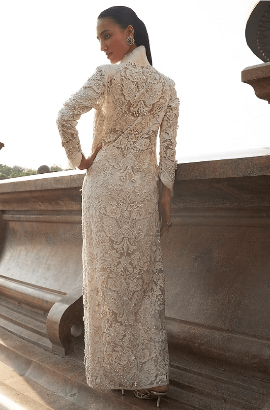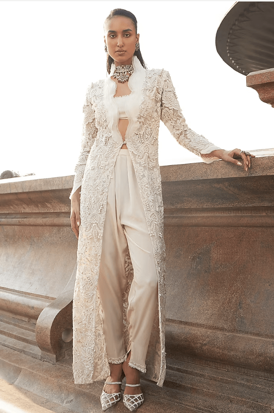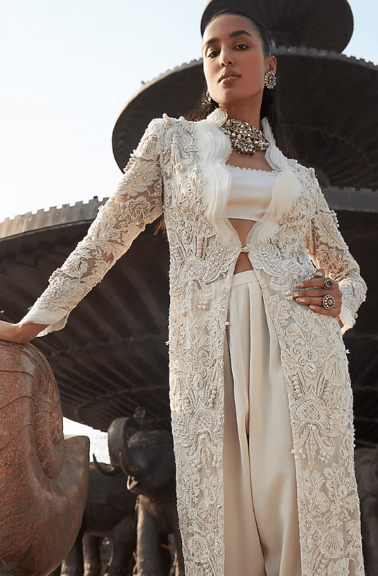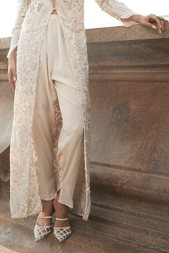 Ivory Jacket Set that captivates with its elegance. The eye-catching jacket is crafted in pure organza and crepe with pearl detail. It is paired with an embellished blouse and pants. Accessorize the designer jacket set with statement earrings and heels for weddings, sangeet or engagement ceremonies.