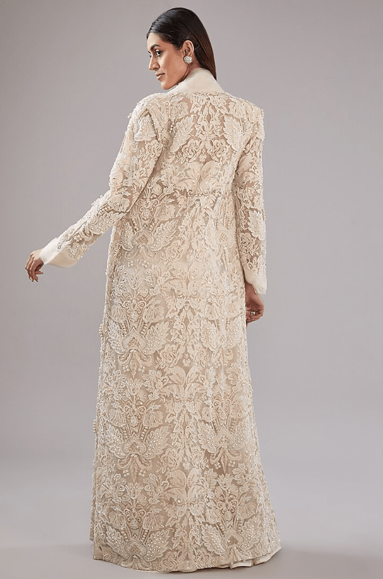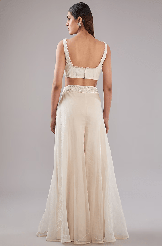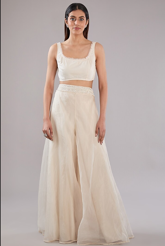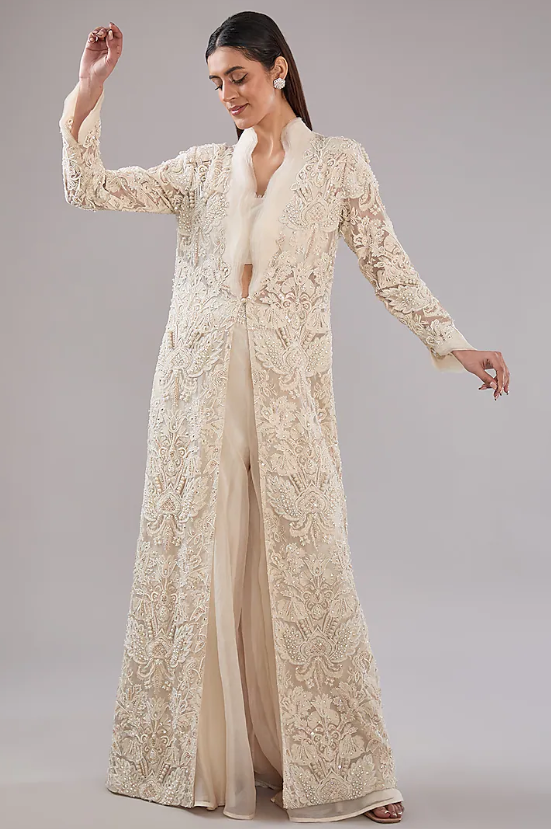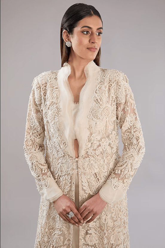Featuring an ivory jacket in pure organza and crepe base with pearl embroidery. It is paired with pants and an embellished blouse. Accentuate it with statement jewellery and heels for festive occasions.