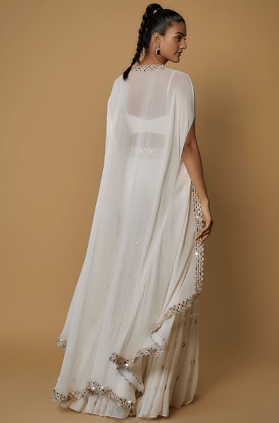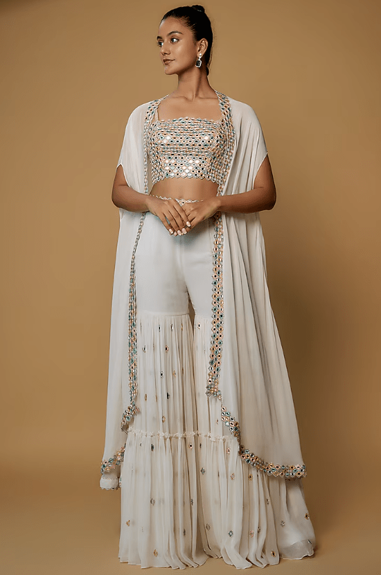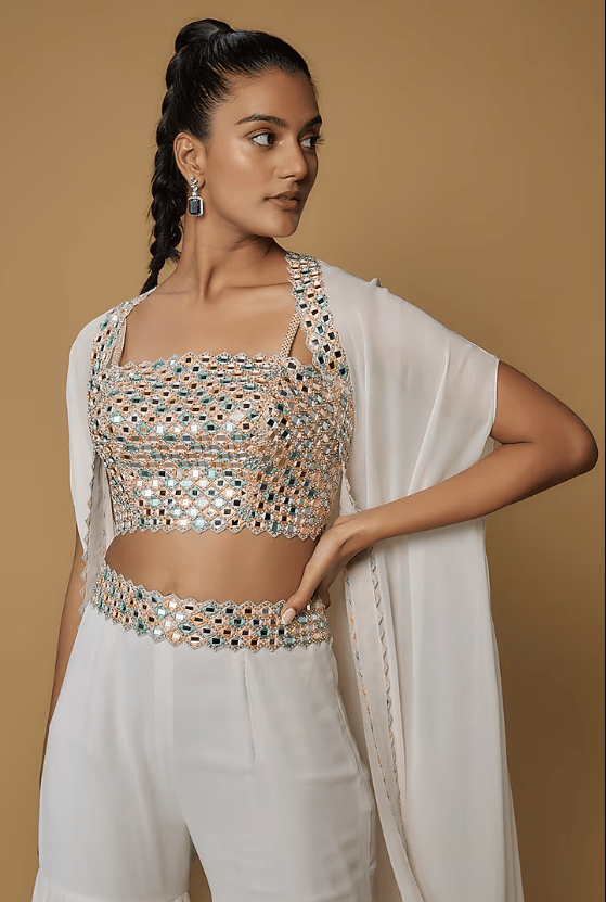 Featuring an ivory cape in raw silk and georgette base with mirror work. It is paired with a matching bustier and tiered pants. Perfect wear for the mehendi ceremony.