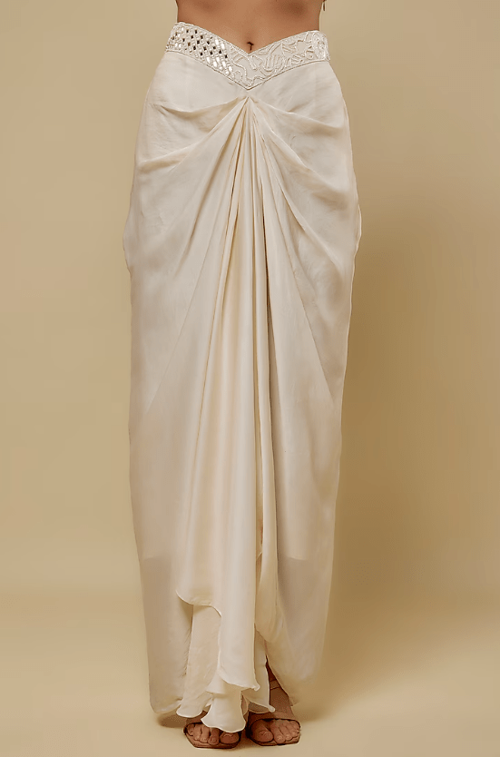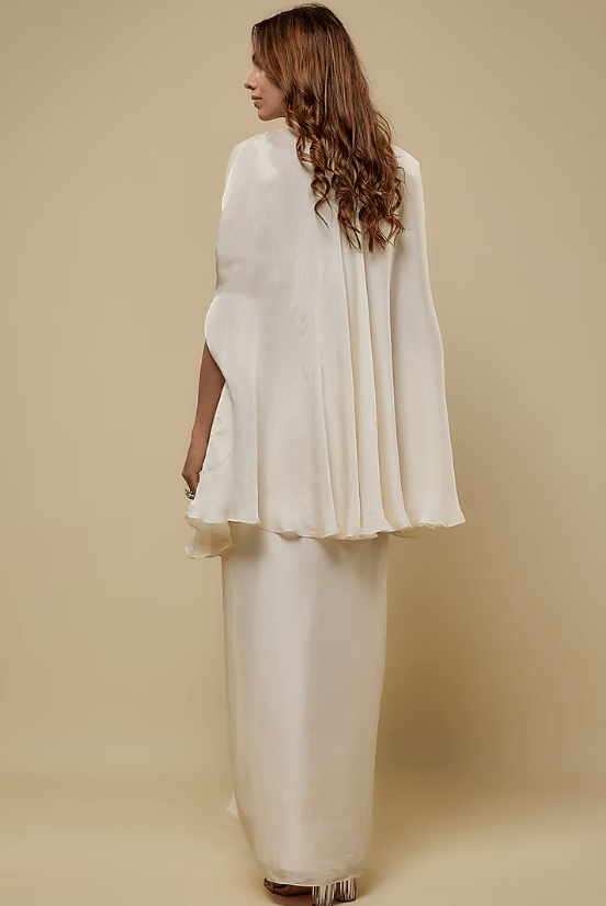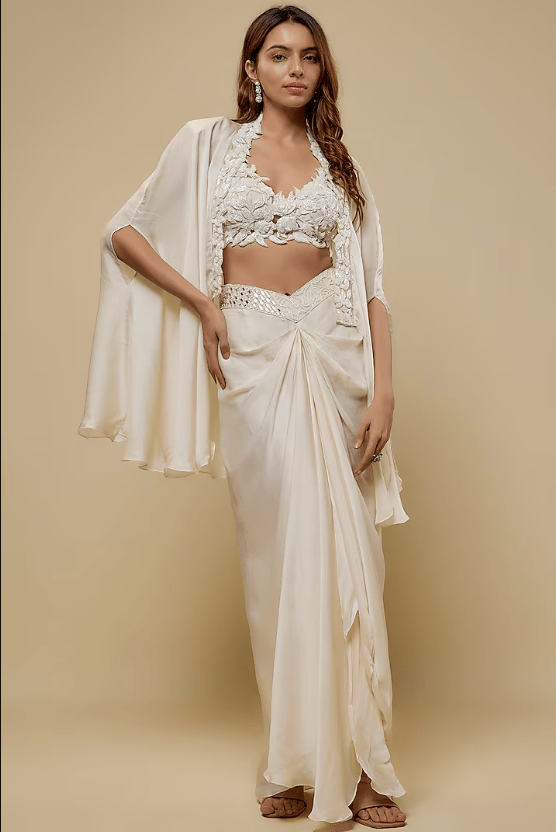 Featuring an ivory cape in satin organza and tulle base with embroidery. It is paired with an embroidered blouse and a draped skirt. Accentuate with statement earrings and heels for a festive occasion.