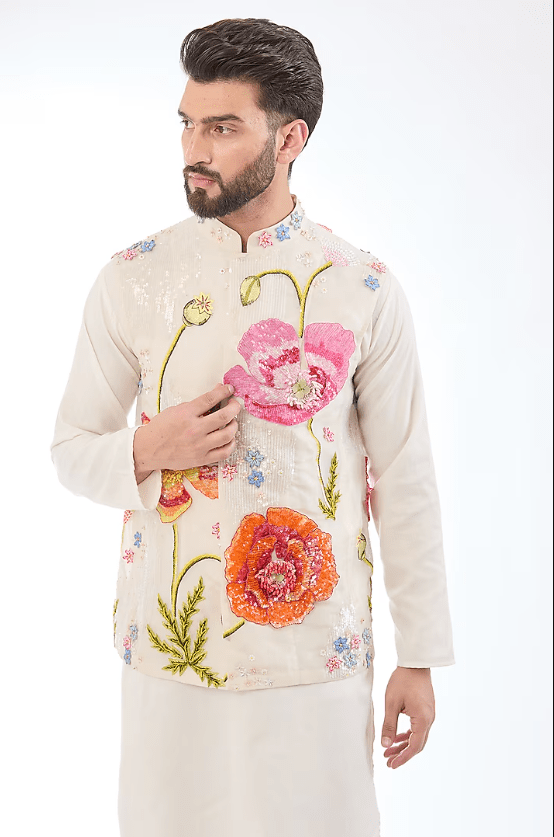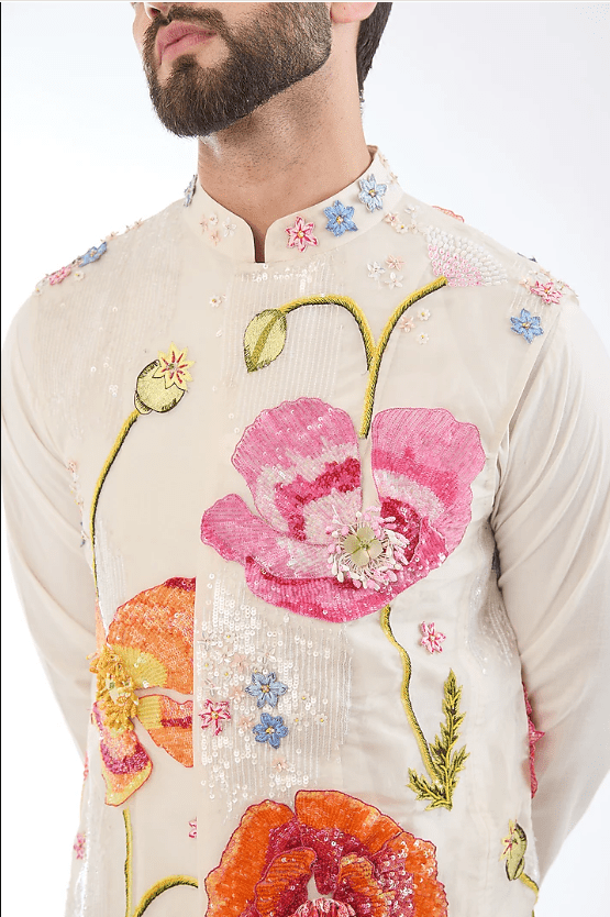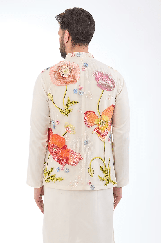 Featuring an ivory bundi jacket in silk organza base with hand embroidery. Perfect for a wedding or engagement ceremony.