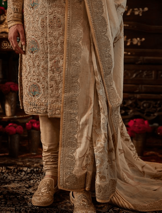 On Sagar, an ivory silk sherwani. The jacket features floral and avian artworks gleaned from Mughal miniature art, which are layered within a dabbi-jaal formed by intersecting organic leaf motifs. It is paired with an embroidered kurta, a churidar pyjama and handcrafted shoes. The look is completed with an embroidered odhna.