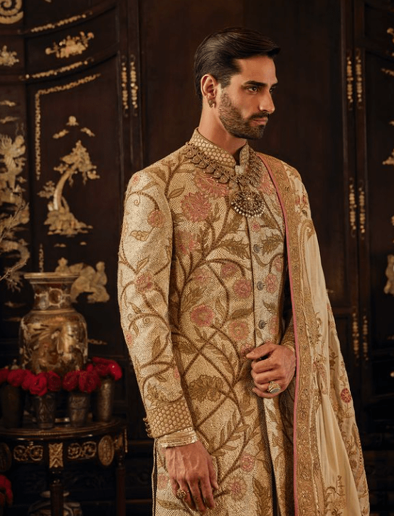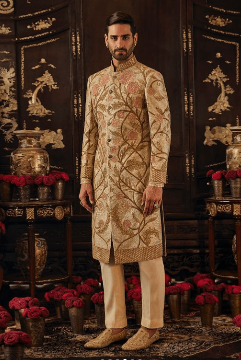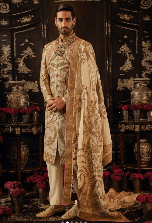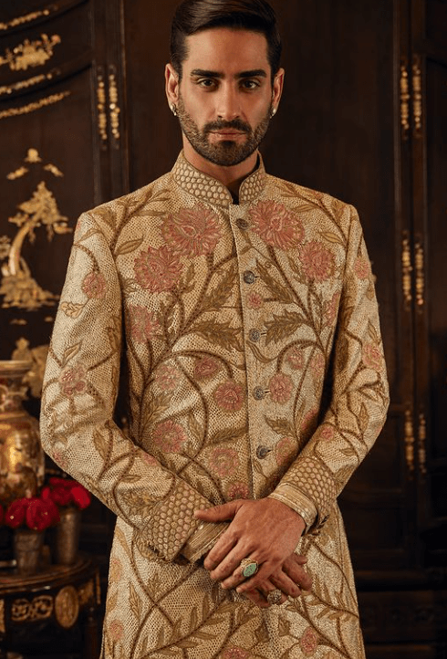 On Eduardo, an ivory silk sherwani. The jacket features intertwined floral vines derived from Mughal architectural details, layered over pittah-work. It is paired with an embroidered kurta, a pair of slim pants and handcrafted shoes. The look is completed with an embroidered dushala.