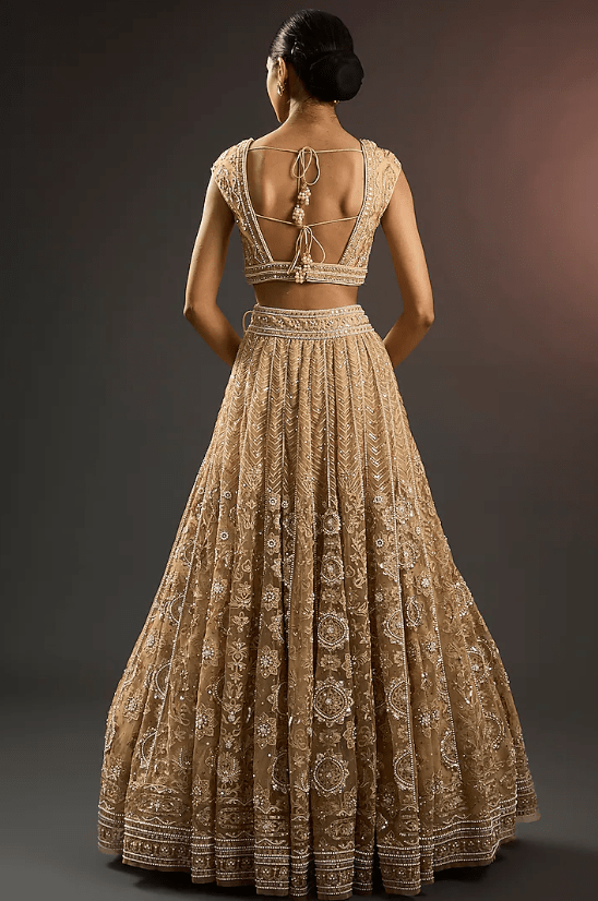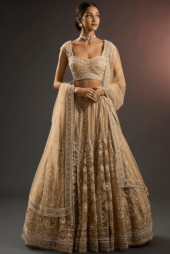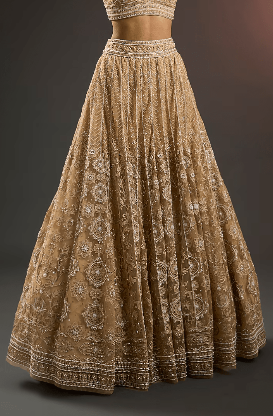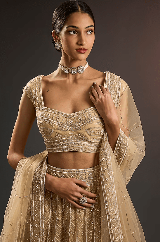Featuring an ivory kalidar lehenga in soft net base with sequins and pearl embroidery. It is paired with an embroidered blouse and a dupatta. Accentuate it with polki jewellery and heels for a perfect bridal look.