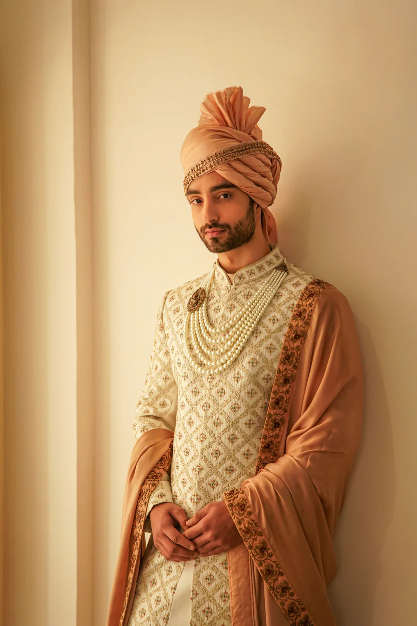 Exude timeless elegance in our ivory sherwani adorned with intricate jaal hand embroidery. Paired with an old rose ombre stole, ivory kurta, and churidar, this ensemble radiates sophistication and grace, making it the perfect choice for any special occasion.