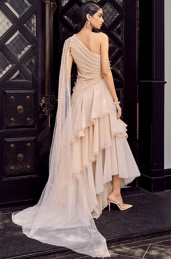 Featuring an ivory asymmetric draped gown in tulle base with embellishments. Accentuate the designer gown with swarovski or zircon earrings, strappy heels and an embellished clutch for evening parties, gala dinners or cocktail ceremonies.