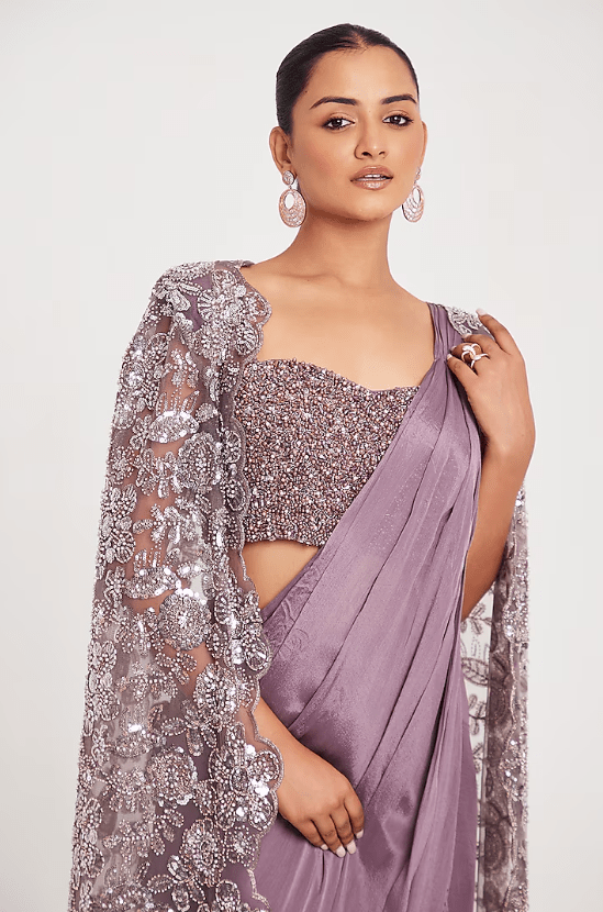 Featuring a lavender pre-stitched saree in chinnon chiffon and net base. It is paired with a blouse and a jacket having zari, pearl, cutdana, beads and stone work. Accentuate with statement earrings and heels for a festive occasion or cocktail ceremony.