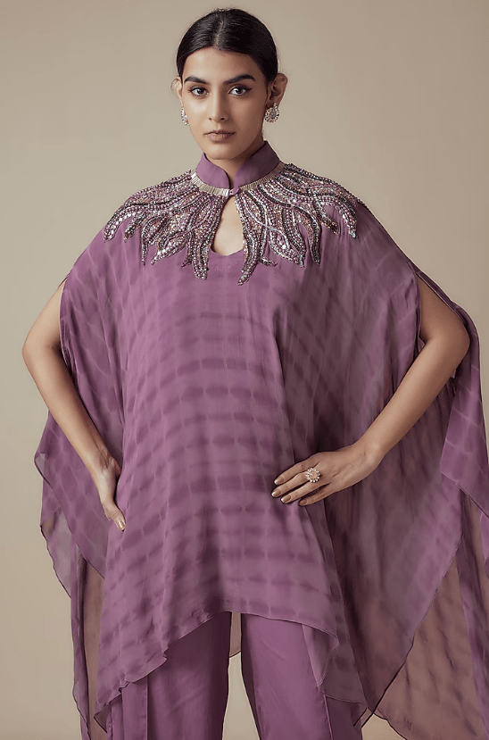 Featuring a lavender hand tie-dye kaftan in georgette and crepe base with mandarin collar, glass beadwork and sequins hand embroidery. It is paired with a camisole and palazzo pants. Accentuate it with statement earrings and heels for a festive occasion or sangeet ceremony.